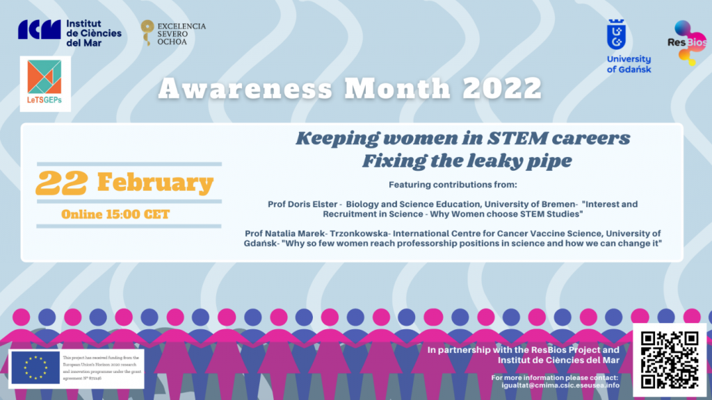 Together with RESBIOS partner Institut de Ciències del Mar (ICM-CSIC) from Barcelona University of Gdansk is taking part in a discussion on Keeping Women in STEM Careers- Fixing the Leaky Pipe on Feburary 22nd at 15:00 CET.