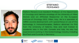 Stefano Persano is an Assistant Professor at the Department of Oncology and Hemato-oncology of the University of Milan Statale and an Affiliated Researcher at the European Institute of Oncology (IEO), Milan, Italy. He is a specialist in mRNA vaccine development. Stefano has academic and biotech experience from Europe, USA and Canada.
